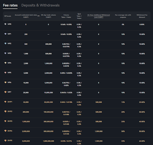 • Competitive futures trading fee structure, with taker fee ranging from 0.007% to 0.2% and maker fee ranging from 0.01% to 0.3%