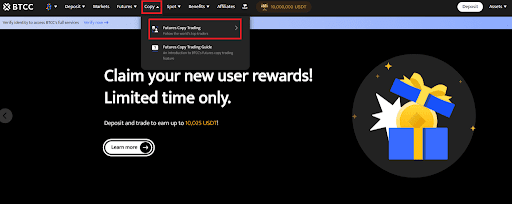 Notably, BTCC claims to cover your first copy trade from losses. Over each campaign period, new copy traders can receive up to 50 USDT in trading funds for coverage if they close their first copy trade and it results in a loss. However, slots are limited to the first 1000 users that must be new copy traders. Users access the copy trading functionality from the Copy section on the web version, as shown in the image below: