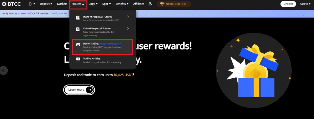 Users access the demo trading functionality from the Futures section on the web version, as shown in the image below: